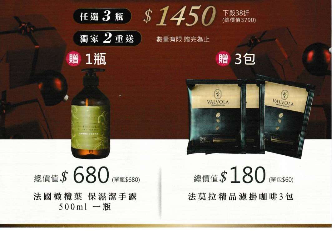 任選三瓶1450元(加贈1瓶保濕潔手露$680元/500ml/瓶+法莫拉精品咖啡包3包)